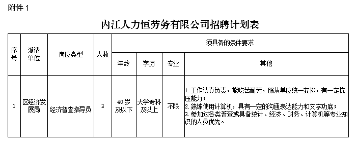 时间:2023-06-16 10:02:58 来源:内江高新江粉儿从“内江高新”获悉,内江人力恒劳务有限公司招聘劳务派遣人员(内江高新区经发局),详情如下。