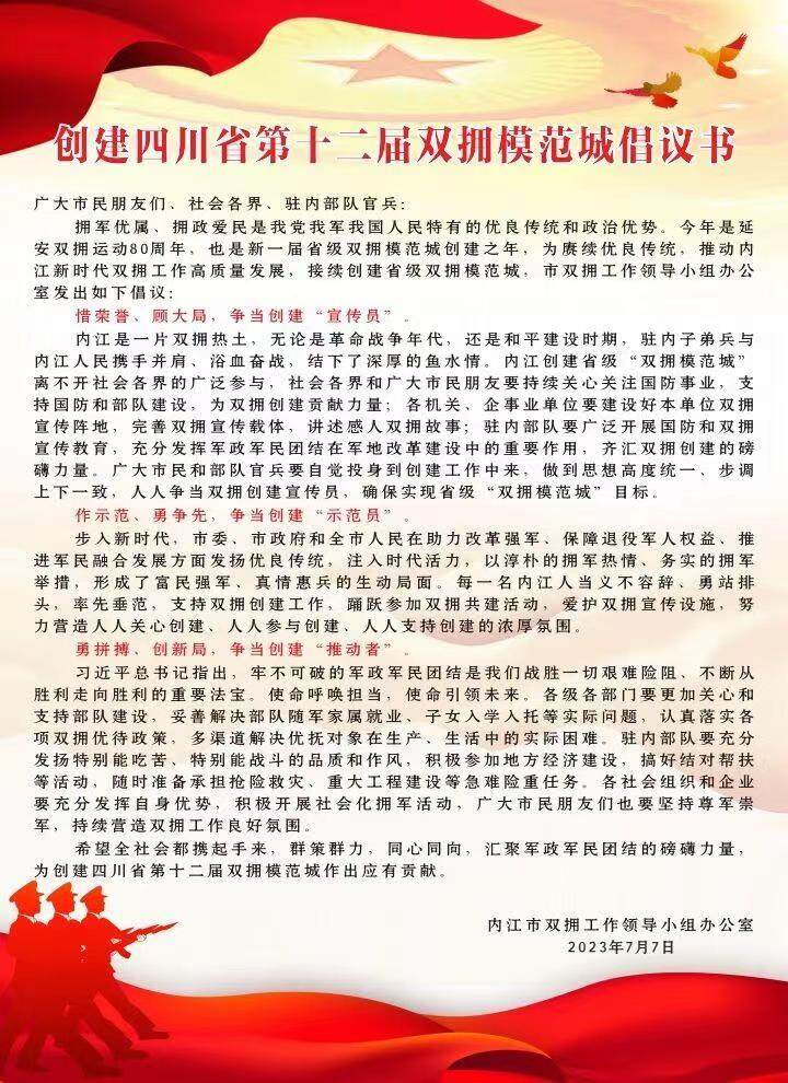 创建四川省第十二届双拥模范城倡议书