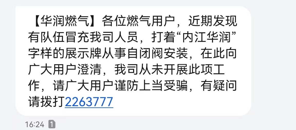 华润燃气:各位燃气用户,近期发现有队伍冒充我司人员,打着“内江华润”字样的展示牌从事自闭阀安装,在此向广大用户澄清,我司从未开展此项工作,请广大用户谨防上当受骗,有疑问请拨打2263777。