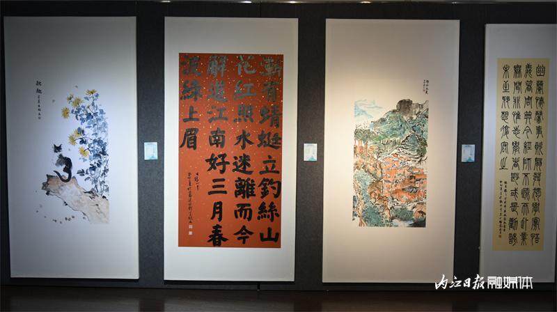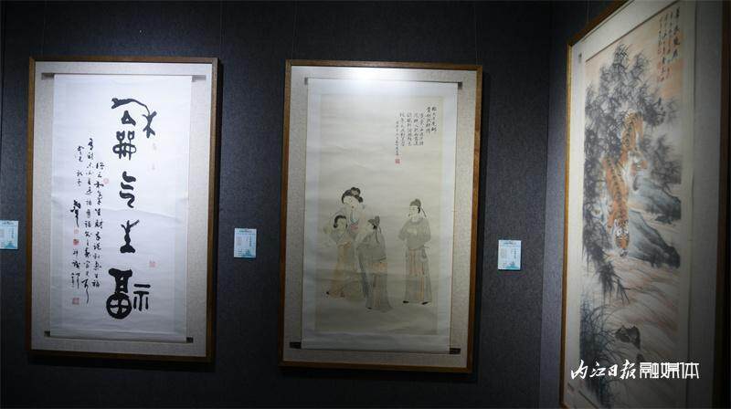 楼上,三个展厅全部挂满了书画作品,各有特色,“大千故里·翰墨薪传”书画作品展在此举行,包括张大千纪念馆馆藏精品展、“大千故里·翰墨薪传”内江市大千画派青少年优秀书画传习作品展、“大千画派创研基地”书画名家作品展示展销,共展出书画作品105幅,其中包含馆藏精品30幅、青少年优秀书画传习作品42幅、“大千画派”创研基地书画名家作品33幅。