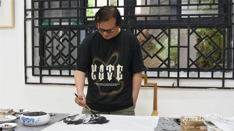 ▲8月22日下午,大千画派创研基地筹备第二届青少年书画传习大会研学活动,图为画家现场作画。