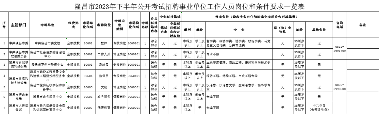 具体考聘岗位要求的条件和资格(详见《隆昌市2023年下半年公开考试招聘事业单位工作人员岗位和条件要求一览表》)。