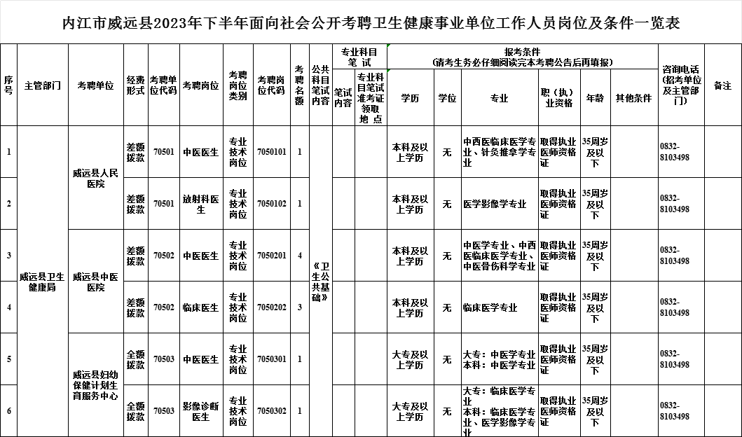 考聘岗位所需的具体条件及资格要求,详见《2023年下半年内江市威远县卫生事业单位公开考聘工作人员岗位及条件要求一览表》。