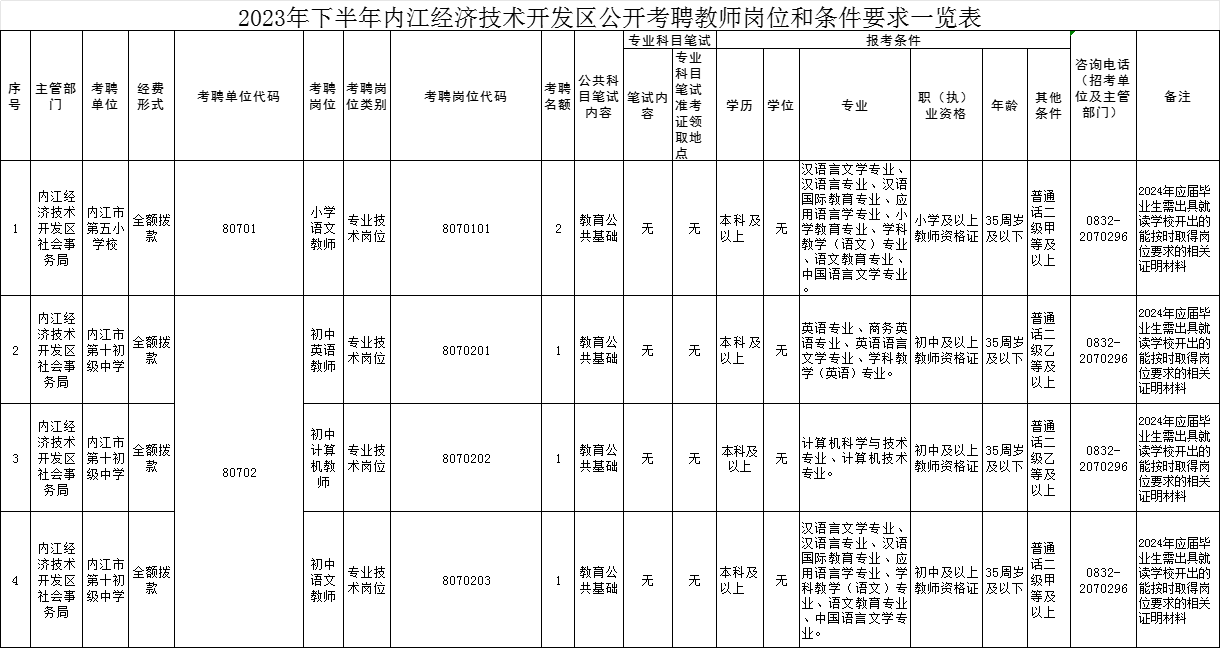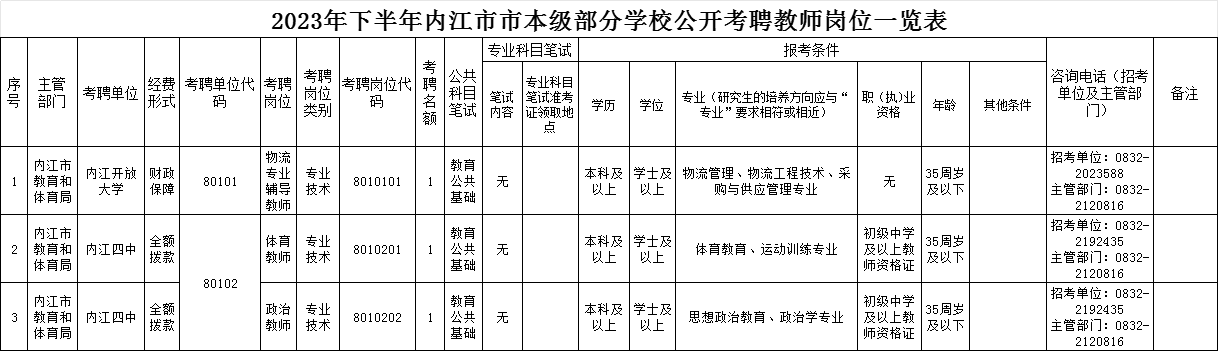 考聘岗位所需的具体条件及资格要求,详见《2023年下半年内江市市本级部分学校公开考聘教师岗位一览表》。