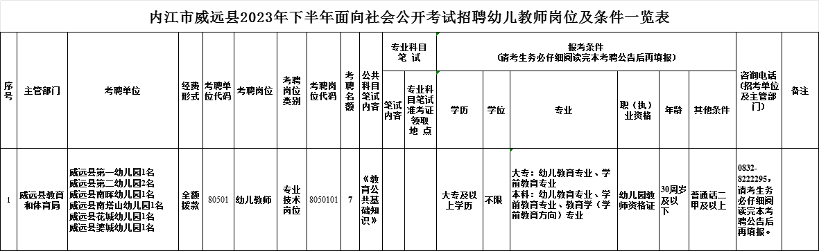 公告原文:关于2023年下半年威远县面向社会公开考试招聘幼儿教师的公告