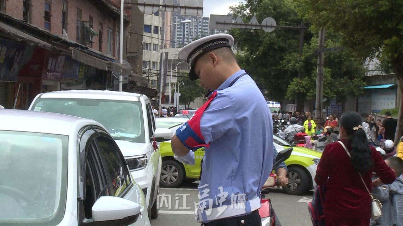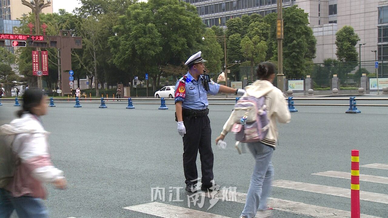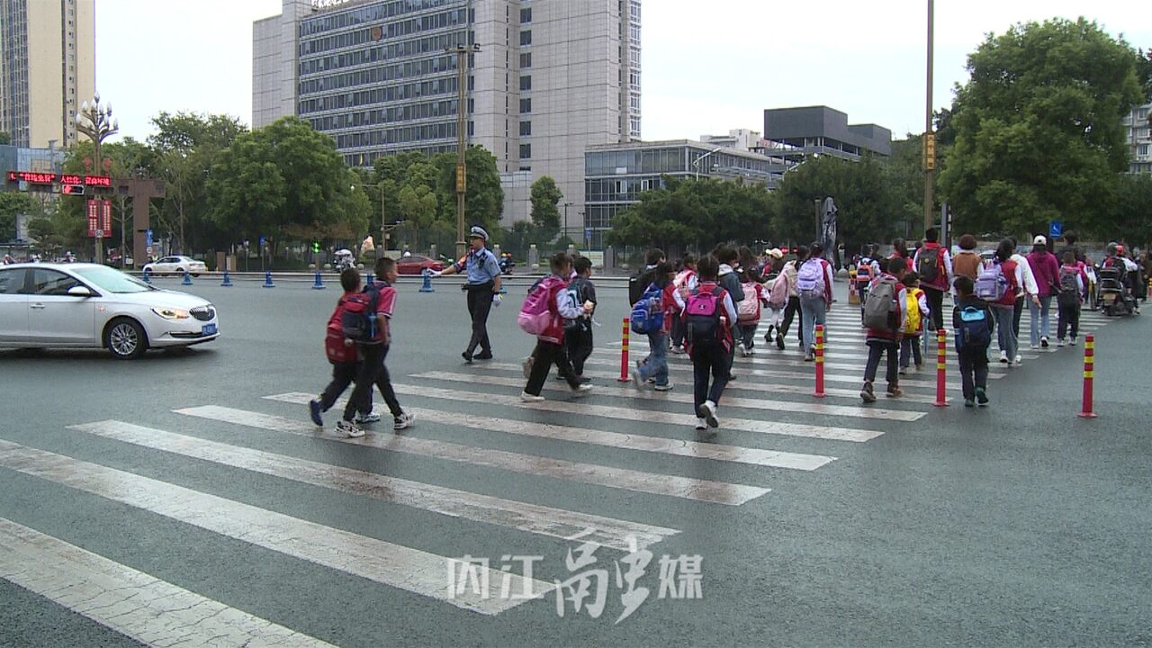 内江交警直属三大队二中队辅警刘宇:“每天早晚上下学高峰期我们会安排护校人员在学校门口执勤,指挥交通保障学生安全通过马路,尤其是下午放学车流量人流量大的时候,我们会对车辆临时管控,保障学生和家长安全的通过人行横道。”