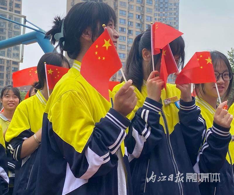 上午9时,奏唱中华人民共和国国歌,五星红旗伴着朝阳升起,歌声响彻操场上空,学生代表在国旗下作《新时代中国青年要始终高举爱国主义伟大旗帜》演讲。随后,学生团队上台,集体朗诵《青春》,大家纷纷挥动手中的红旗,高唱赞歌,共同庆祝祖国生日。