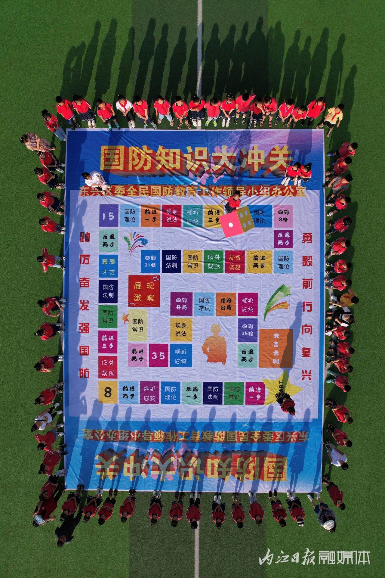 学生们4人为1组,通过掷骰子、走格子、答题、闯关的形式,学习巩固国防知识,活动趣味性十足,吸引了诸多学生参与,现场一片欢声笑语。