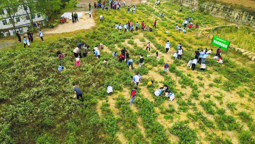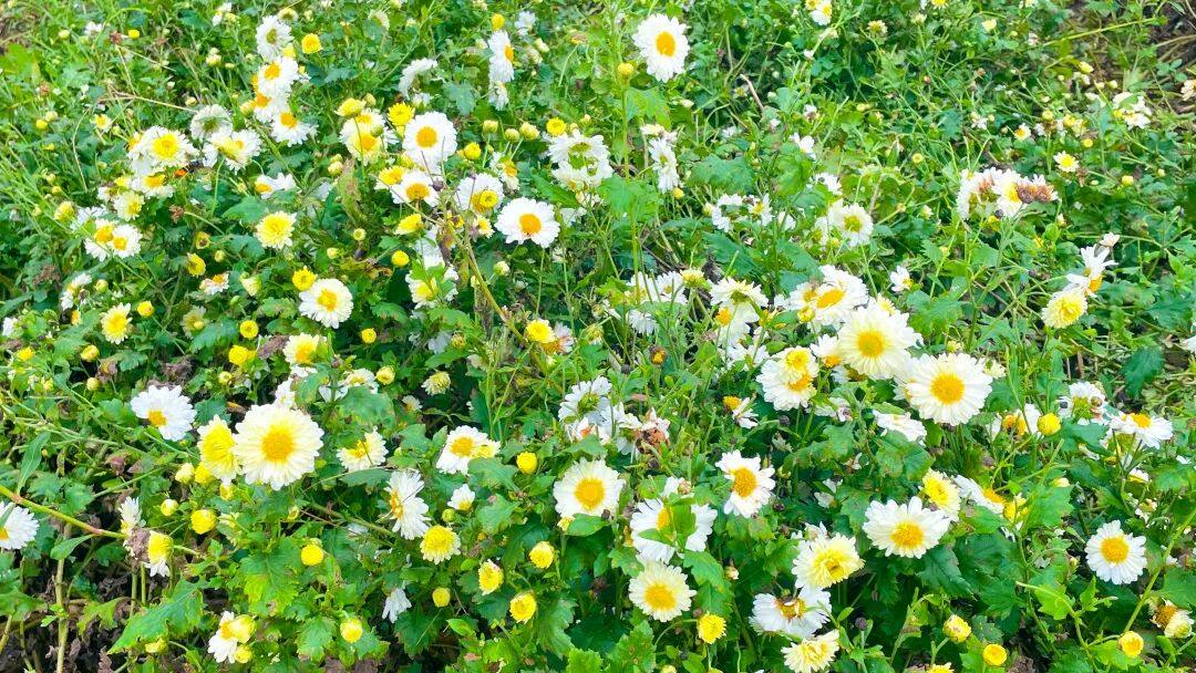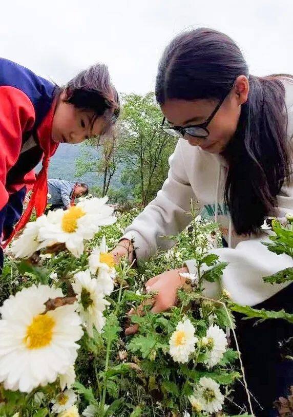 在越溪中心校的实践基地,一簇簇、一丛丛的杭白菊竞相盛开着。学生们积极参与着劳动体验——采摘杭白菊。