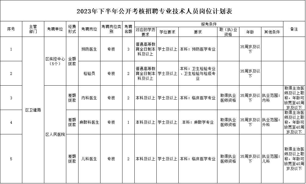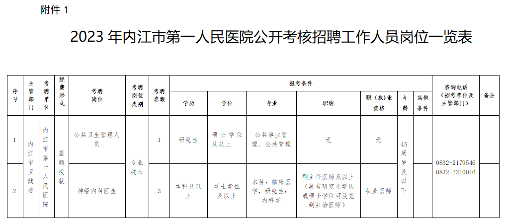 具体考核招聘单位及岗位名额、条件详见附件1:《2023年下半年内江市市中区卫健系统公开考核招聘专业技术人员岗位一览表》。