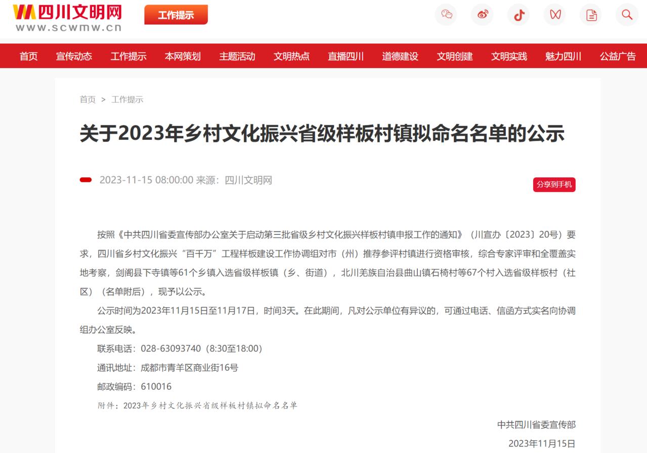 时间:2023-11-16 09:02:53 来源:四川在线、四川发布11月15日,记者从中共四川省委宣传部了解到,2023年乡村文化振兴省级样板村镇拟命名公示名单已出炉。四川省乡村文化振兴“百千万”工程样板建设工作协调组对市(州)推荐参评村镇进行资格审核,综合专家评审和全覆盖实地考察,剑阁县下寺镇等61个乡镇入选省级样板镇(乡、街道);北川羌族自治县曲山镇、石椅村等67个村入选省级样板村(社区)。公示时间为2023年11月15日至11月17日,时间3天。其中,内江市市中区龙门镇、内江市东兴区田家镇拟命名省级样板镇(乡、街道),隆昌市石燕桥镇净土村、威远县新店镇民富村、资中县鱼溪镇红莲村拟命名省级样板村(社区)。