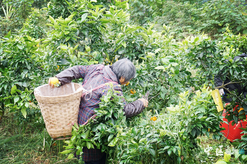 随后,记者来到了位于花洞村1社的另一个果园。果树下,工人们正小心翼翼地将成熟了的果实采摘下来放入背篓中,远处的空地上堆满了刚刚摘下来的柑橘,大家喜笑颜开,因为今天将有果商前来收购。