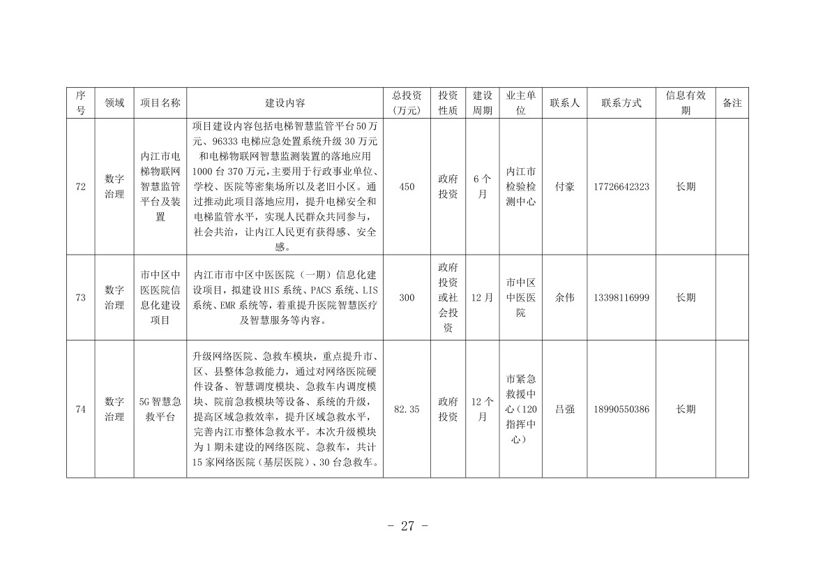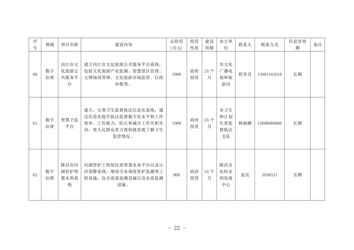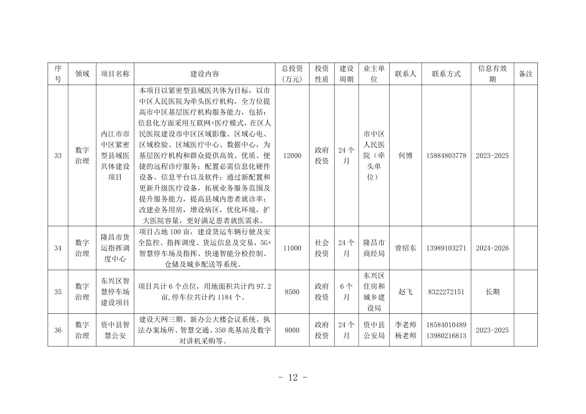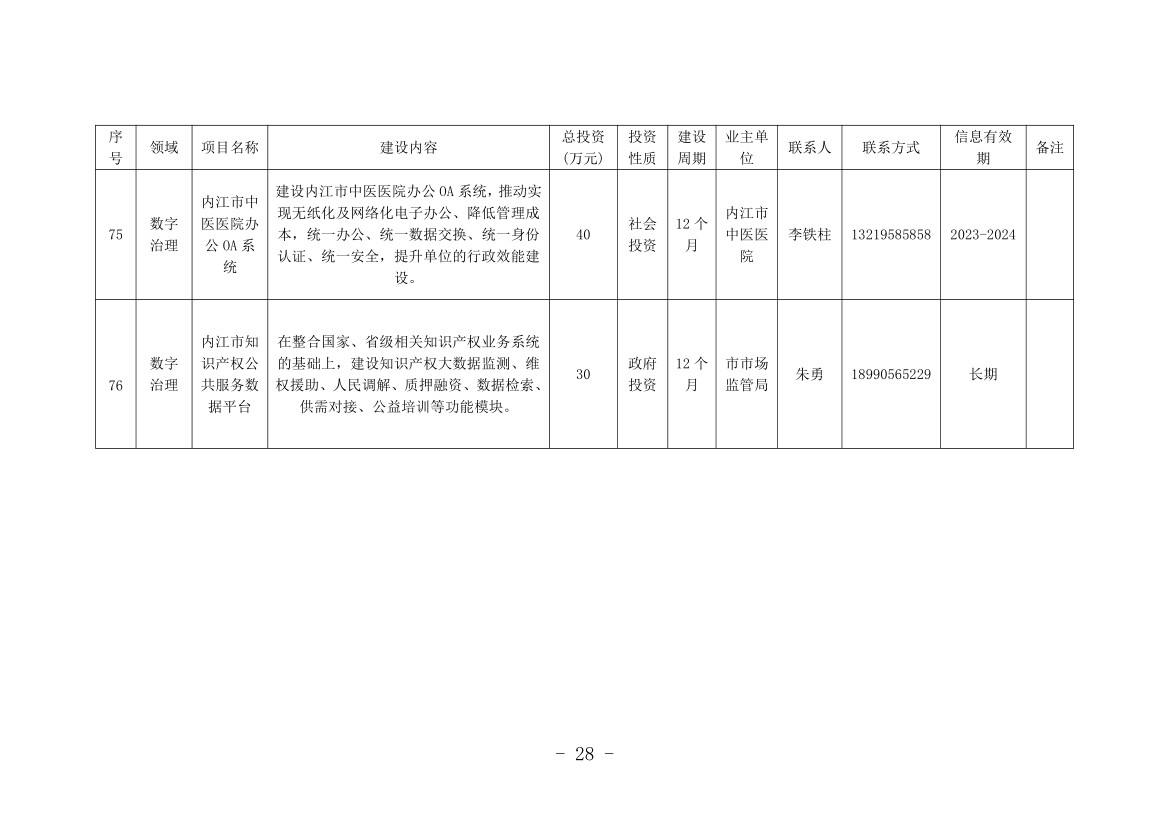 记者从机会清单中看到,本次清单涉及内江全市8个县(市、区)和11个市级有关部门(单位),包括数字产业化、产业数字化和数字治理3个大类,项目总计76个,计划投资金额252.47亿元。其中,数字产业化项目8个,计划投资金额136.3亿元;产业数字化项目14个,计划投资金额64.34亿元;数字治理项目54个,计划投资金额51.83亿元。
