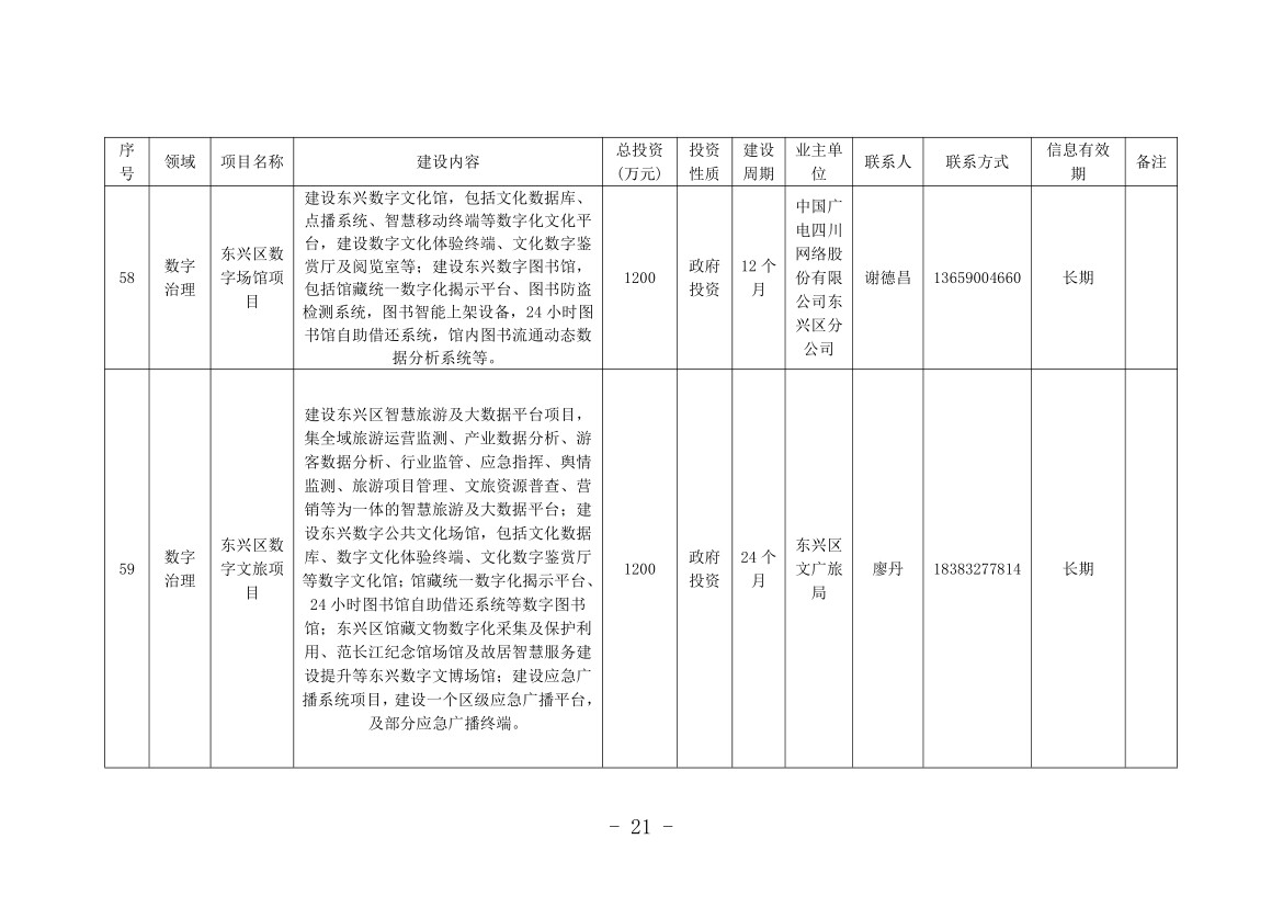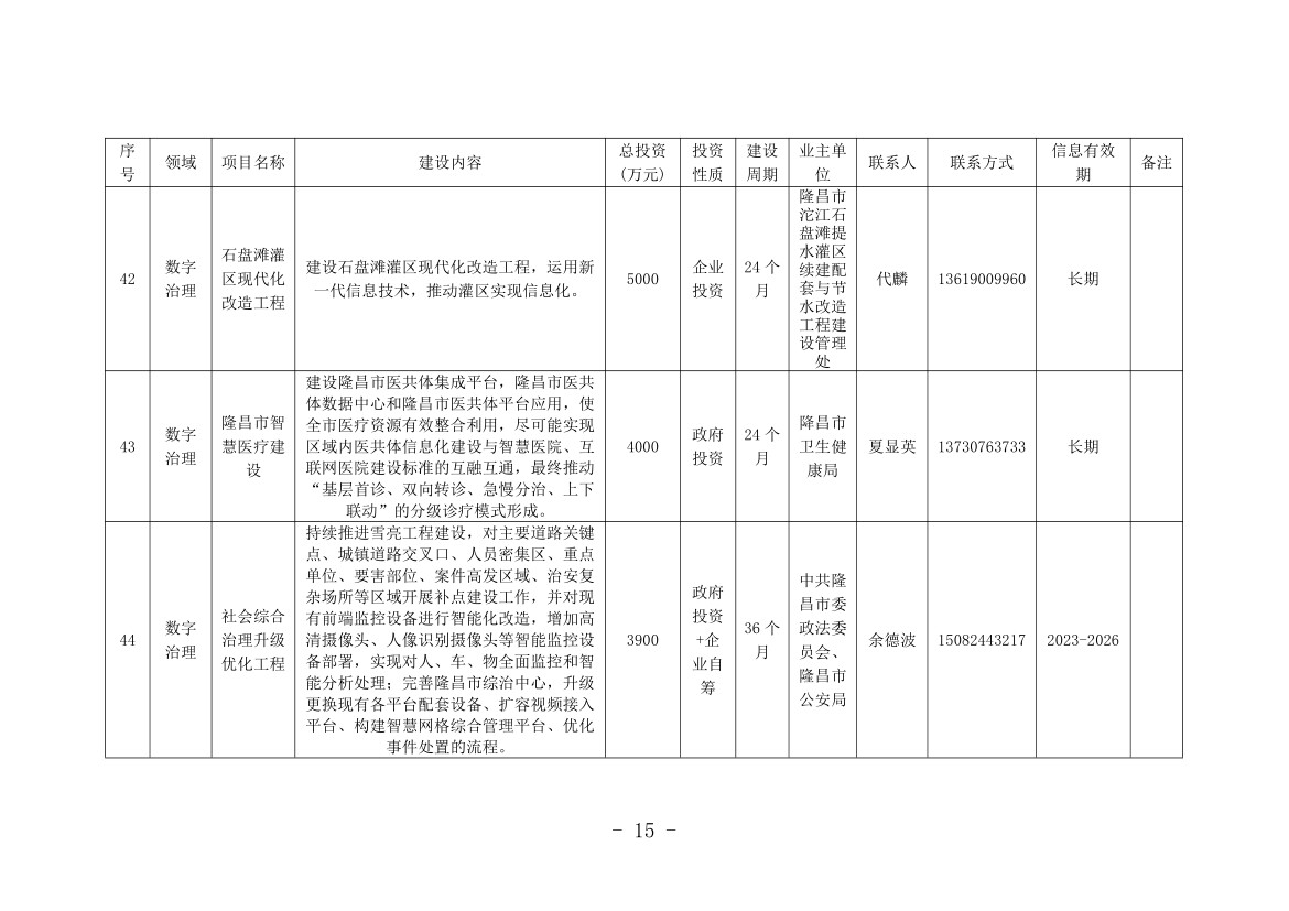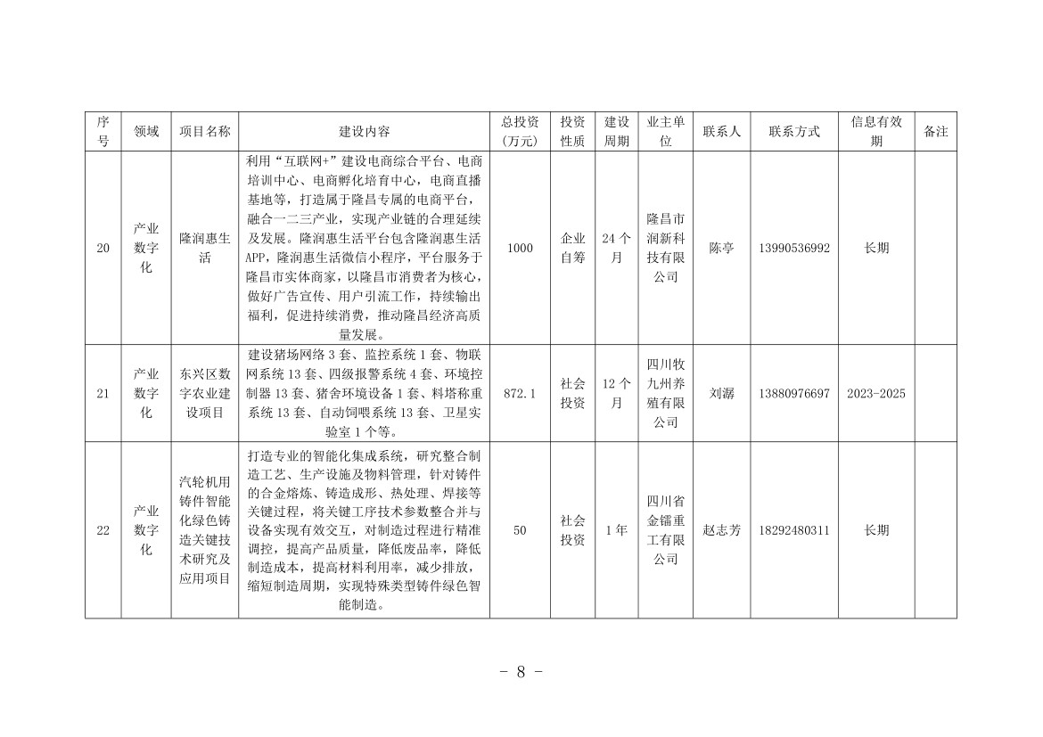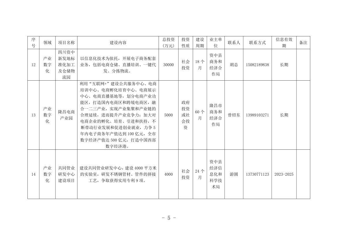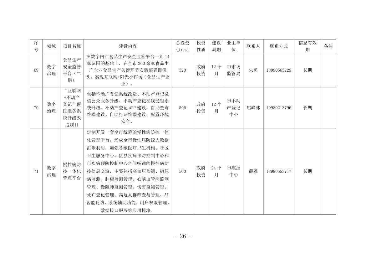 记者从机会清单中看到,本次清单涉及内江全市8个县(市、区)和11个市级有关部门(单位),包括数字产业化、产业数字化和数字治理3个大类,项目总计76个,计划投资金额252.47亿元。其中,数字产业化项目8个,计划投资金额136.3亿元;产业数字化项目14个,计划投资金额64.34亿元;数字治理项目54个,计划投资金额51.83亿元。