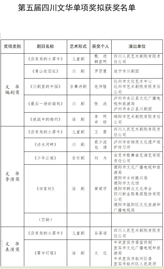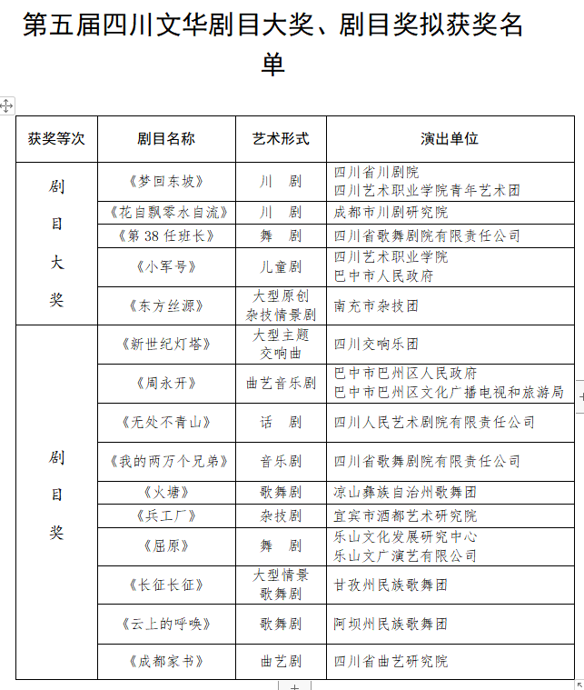 时间:2023-12-04 15:23:55 来源:四川观察记者12月4日从四川省剧目工作室(四川艺术基金管理中心)获悉,根据《四川省文化和旅游厅关于开展第三届四川艺术节精品剧目展演暨第五届四川文华奖参评剧目推荐申报工作的通知》《四川文华奖章程》《四川文华剧目大奖、剧目奖、单项奖评选方案》《四川文华剧目大奖、剧目奖、单项奖评选办法》,经专家评审、组委会复核,第五届四川文华奖最终评选出《梦回东坡》《花自飘零水自流》《第38任班长》《小军号》《东方丝源》5个文华剧目大奖,《新世纪灯塔》《周永开》等10个文华剧目奖,以及5个文华编剧奖、5个文华导演奖、5个文华表演奖、4个文华音乐奖、4个文华舞美奖。其中,内江川剧《凤鸣山传奇》拟获文华音乐奖、木偶剧《张大千之匪巢磨难》拟获文华舞美奖。