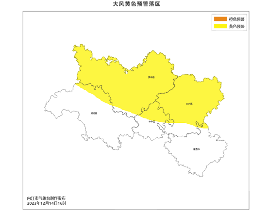 内江市气象台2023年12月14日16时17分发布大风黄色预警:受地面冷空气影响,预计12月15日凌晨开始我市有一次大风天气过程,普遍风力6级。其中,市中区、东兴区、资中县部分地方风力可达到7级。