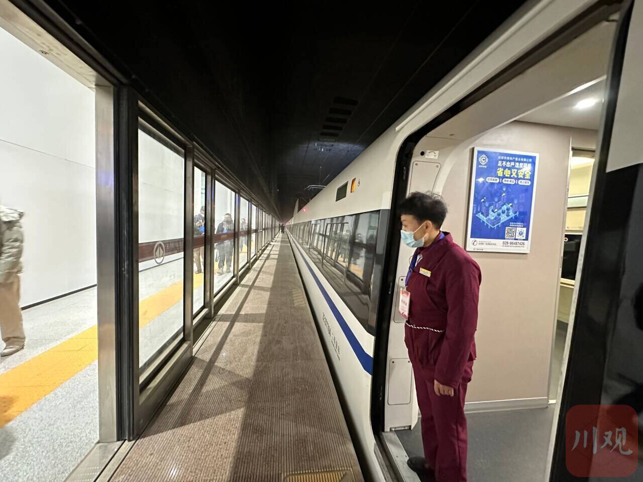穿过龙泉山脉,动车组速度慢慢下降,进入下穿天府机场的隧道后,最终趋于平稳,天府机场站到了!这时,才8:55分。“太快了!”车厢内,试乘体验的人员忍不住感叹。