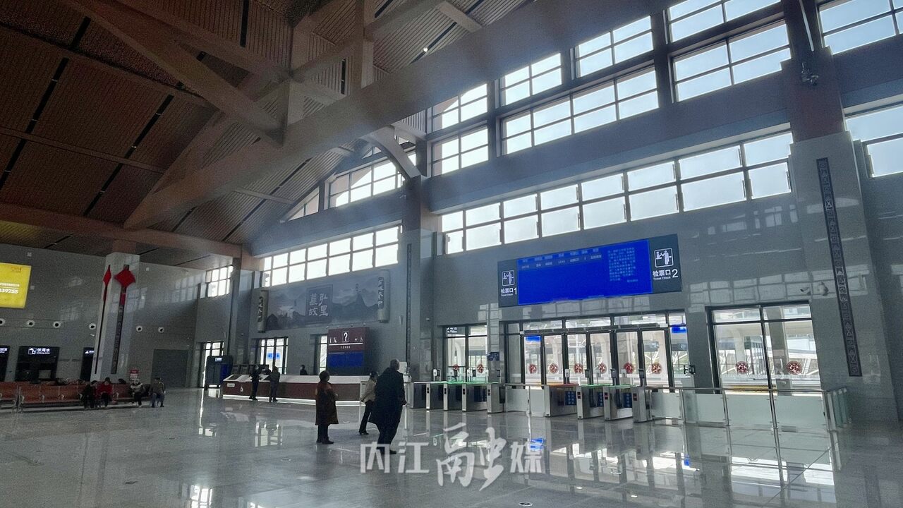 走进站内,高高悬挂的中国结和随处可见的剪纸为即将到来的新年增添了喜庆的氛围。为了迎接旅客的到来,车站已“万事俱备”。“苌弘故里”“状元之乡”两块古城资中的名片分列在检票口两侧。