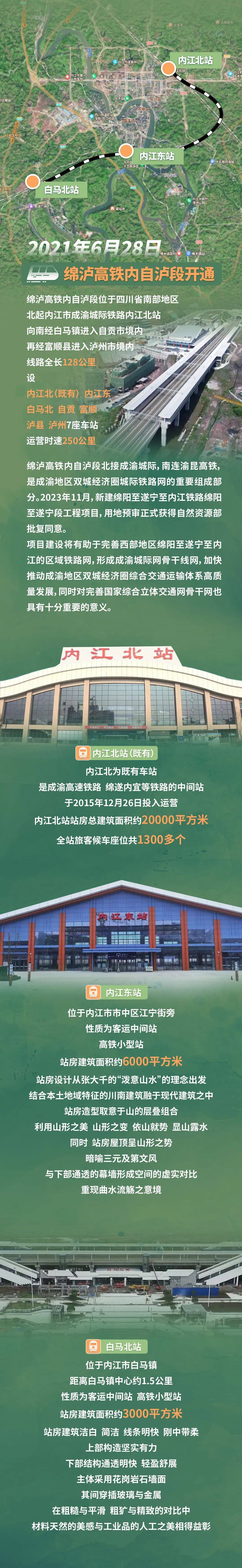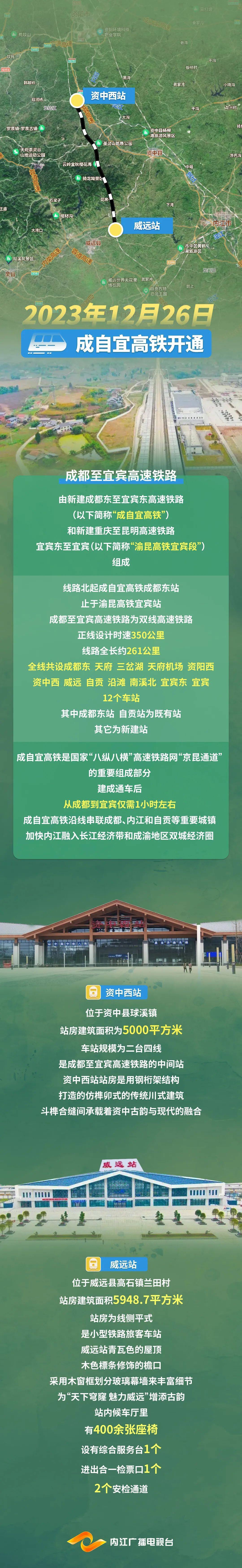 作为全省首条设计时速350公里/小时的高速铁路,成自宜高铁于2018年12月21日开工建设,全长261公里,其中内江段62.5公里。沿线设成都东、天府机场、资阳西、自贡、宜宾东等12个车站,在内江境内设有资中西站和威远站。