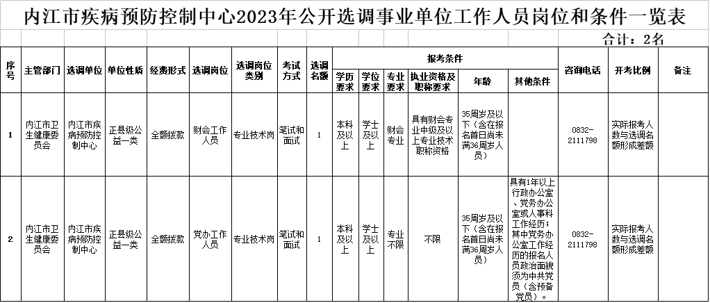 根据内江市人力资源和社会保障局、中共内江市委组织部、中共内江市委机构编制委员会办公室关于转发《四川省事业单位工作人员(流)调动试行办法》(内人社发〔2023〕1号)和中共内江市委组织部、内江市人力资源和社会保障局、中共内江市委机构编制委员会办公室《关于进一步优化内江市事业单位工作人员流(调)动程序的通知》(内人社发〔2023〕12号)文件规定,内江市疾病预防控制中心拟面向社会公开选调2名工作人员。