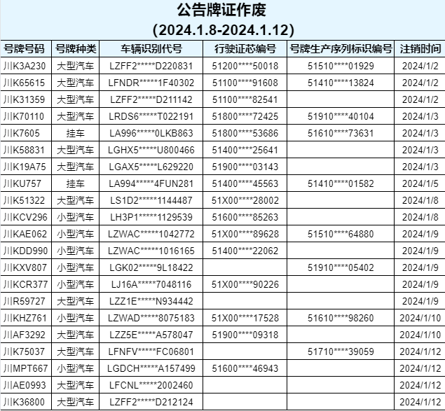 时间:2024-01-24 14:41:09 来源:内江公安交警江粉儿从内江公安交警获悉,内江公安交警支队发布关于机动车牌证作废的公告,详情如下。