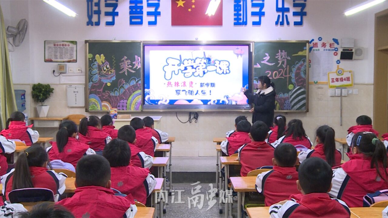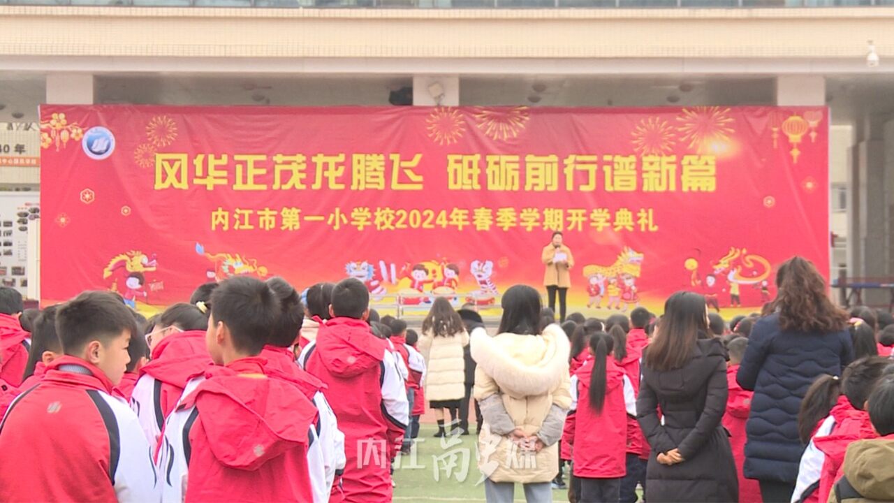 在内江市第一小学校的操场上举行开学典礼,伴随着庄严的国歌,五星红旗冉冉升起,迎风飘扬,全体师生向国旗行注目礼,怀揣梦想和希望,满怀信心拥抱新学期,开启新征程。随后,各班级围绕学习宣传贯彻党的二十大精神、生命安全教育、家庭教育、心理健康教育等内容,开展了形式多样的“开学第一课”活动,引导学生们树立正确的人生观、价值观、世界观,激励学生们在新学期继续努力奋发、逐梦前行。课堂上,学生们还展示了手绘的龙年画作,分享新学期的“成长计划”,以饱满的精神状态,点亮“热辣滚烫”的新学期。