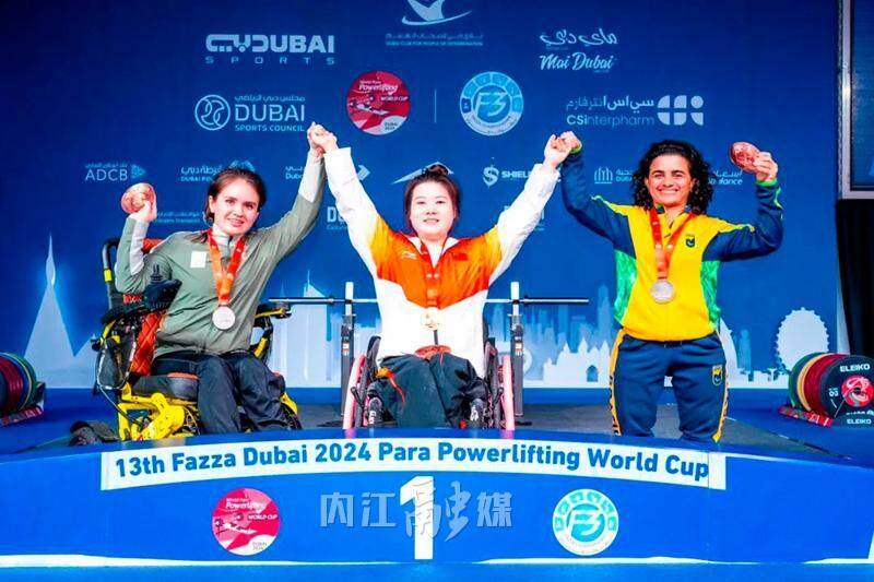 △ 魏怡(中)获2024年迪拜残奥举重世界杯女子五十公斤级冠军