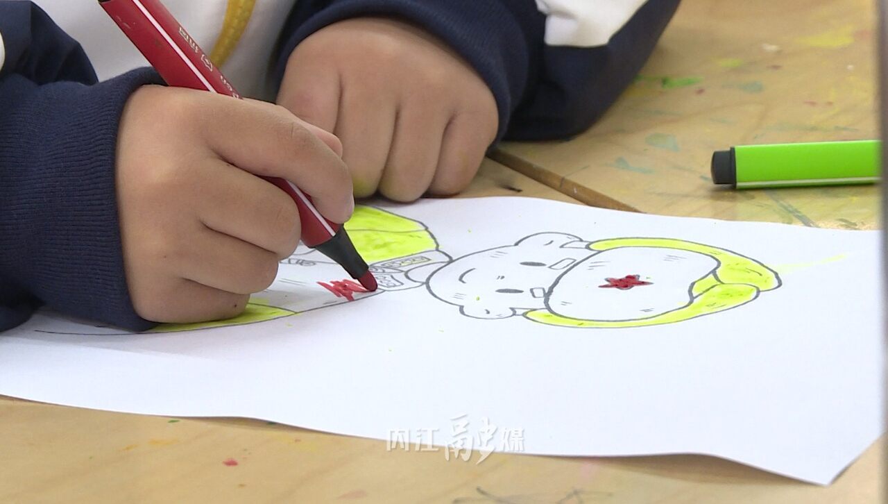 美术活动中,小朋友纷纷拿起桌上画笔,描绘出自己心中的雷锋叔叔模样,并用纸张折叠出“雷锋帽”,画上一个红色五角星,向雷锋叔叔致敬。
