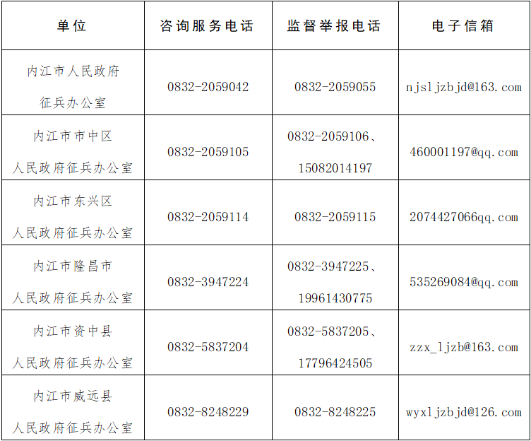 各级征兵办公室咨询服务、监督举报电话和邮箱