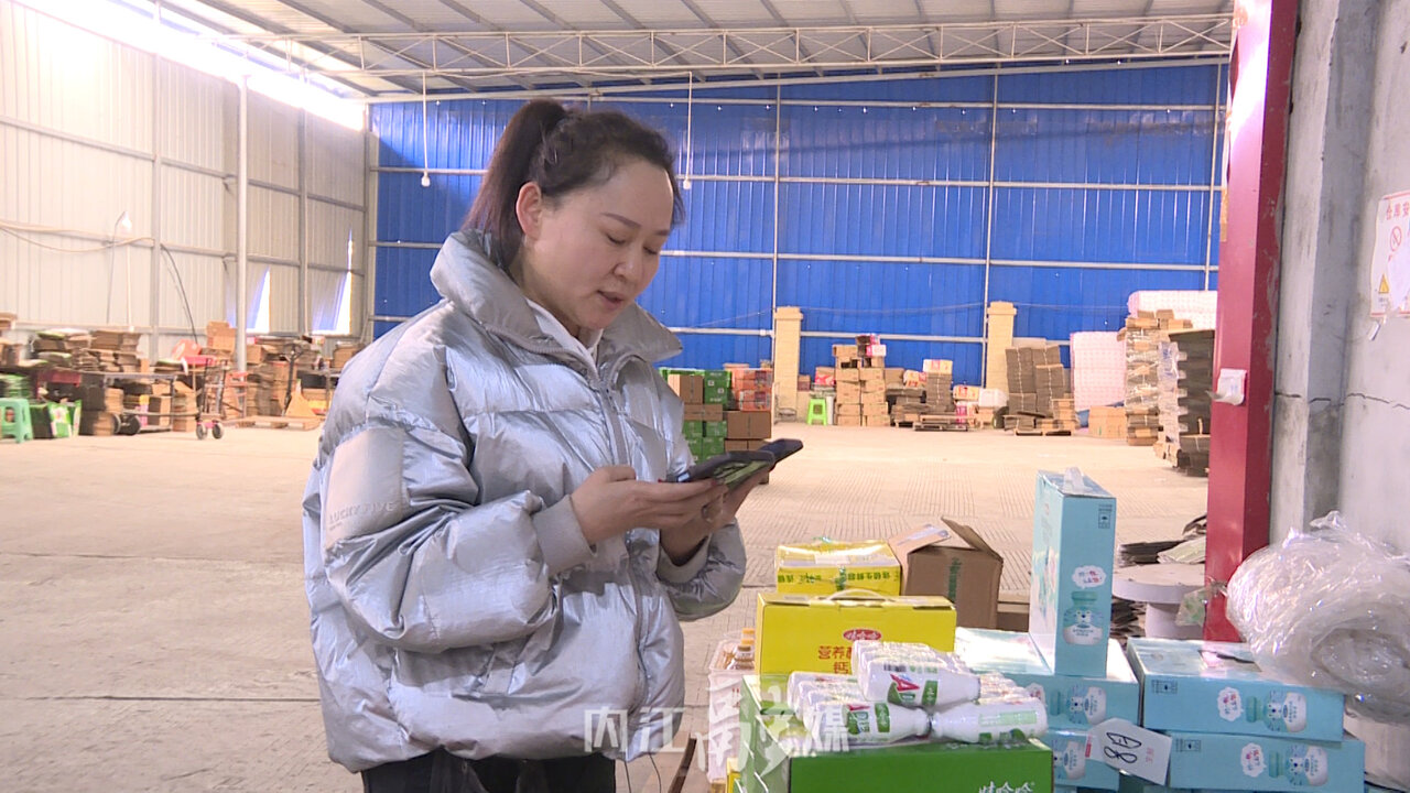 “旺仔(牛奶)只有那一单,19块9;“13块9五瓶脉动没货,脉动是没货的”......3月4日,记者在位于资中县公民镇的四川永利乡鹰电子商务商贸有限责任公司仓储中心看到,主播正忙着用手机直播,销售牛奶、饼干、饮料等生活用品,一旁的工人们则迅速将这些订单货品一件件地清点、装箱、封箱、贴单、上车,通过物流直接发往全国各地,整个现场忙而有序。