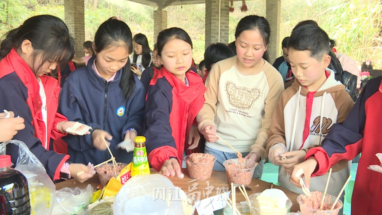 活动中,这边学生们围坐在草地里开展各式趣味活动,感受草原自然魅力,领略春日美好。那边野炊活动现场,学生们在老师和家长的指导下,削皮剥蒜、和馅包抄手,分工有序,现场其乐融融。最终在缕缕炊烟里,热气腾腾的抄手和火锅新鲜出炉,大家围坐在一起,共同分享美味的劳动成果。