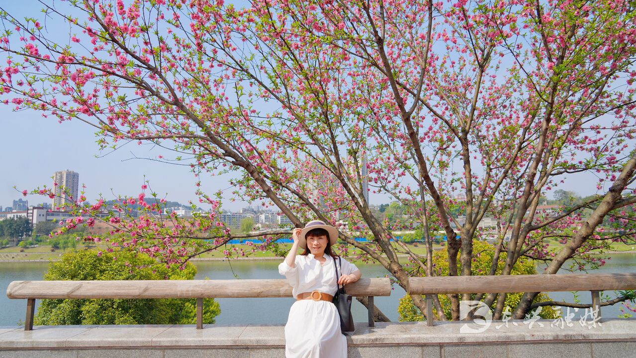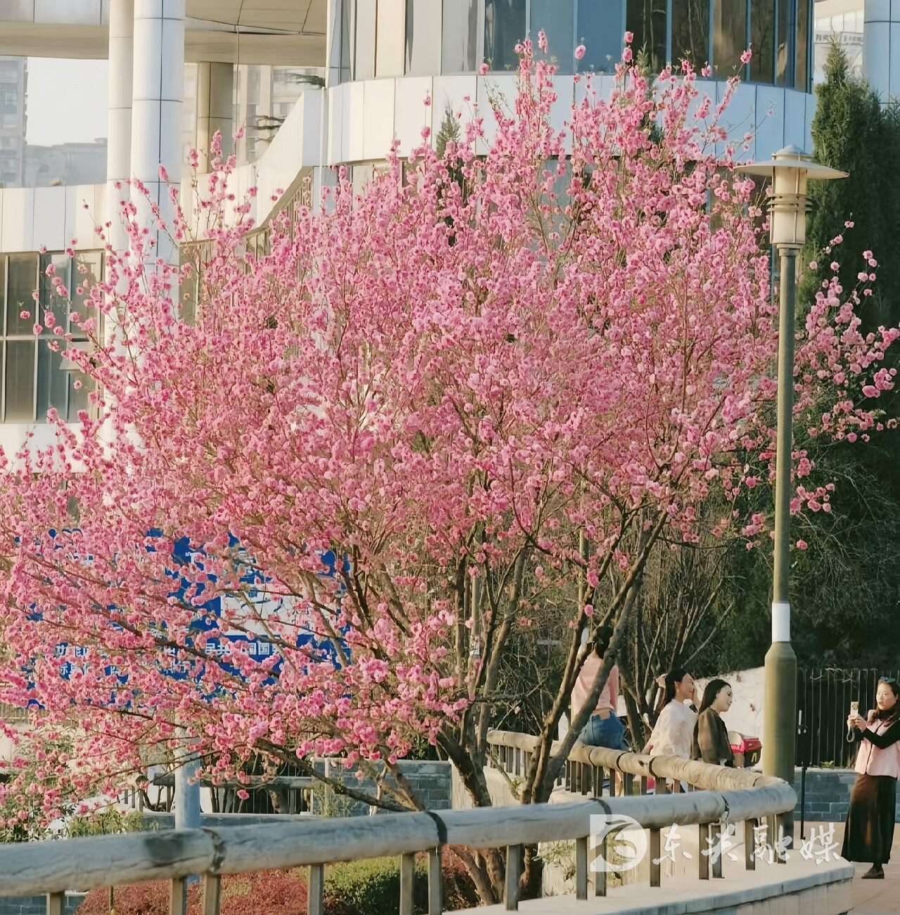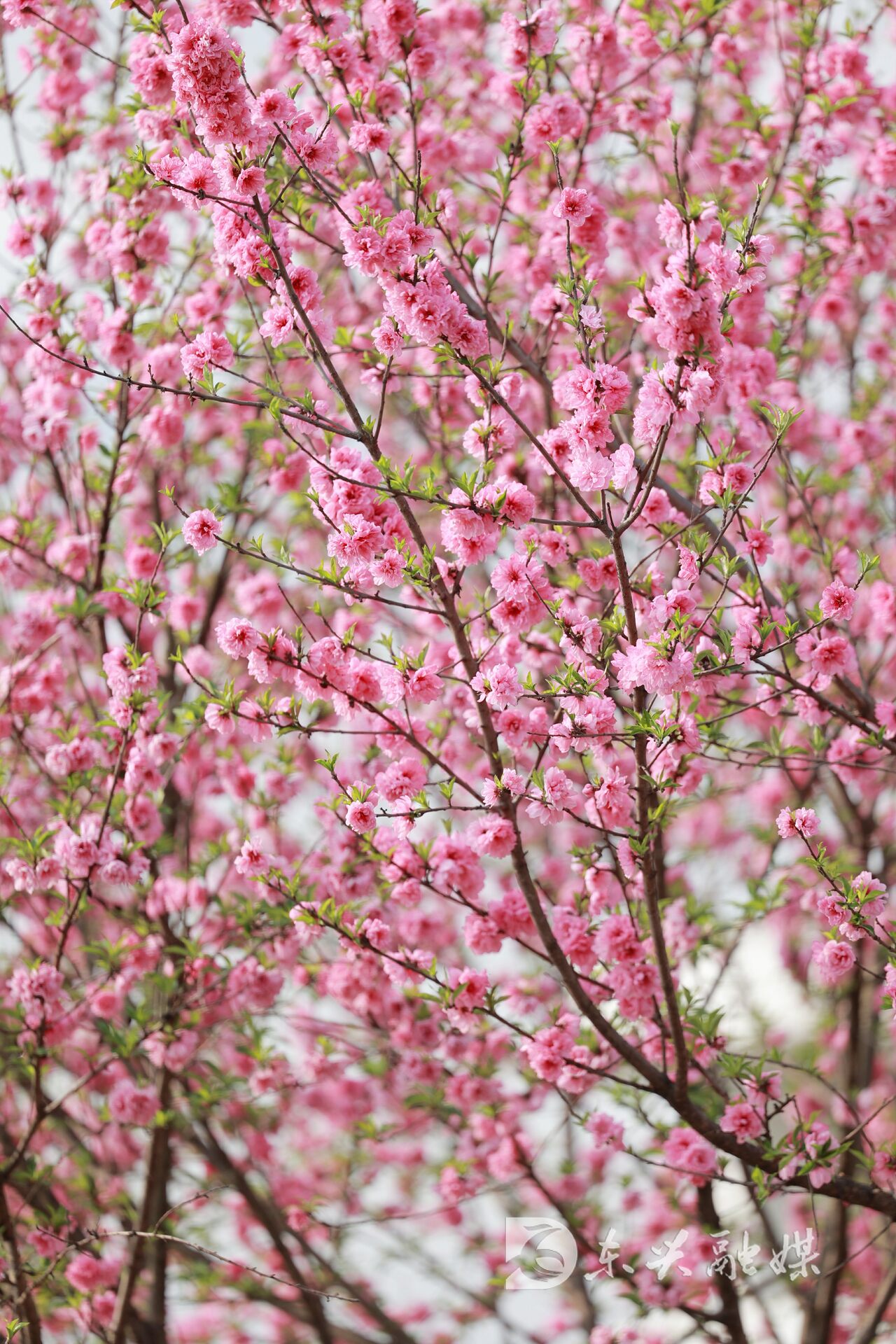 “网红树”是一棵碧桃树,碧桃万树天地春, 红云香阵正萦人。枝丫杈间,碧桃花簇拥成串,傲然盛放,红色的妖娆动人,如诗如画,极尽浪漫。