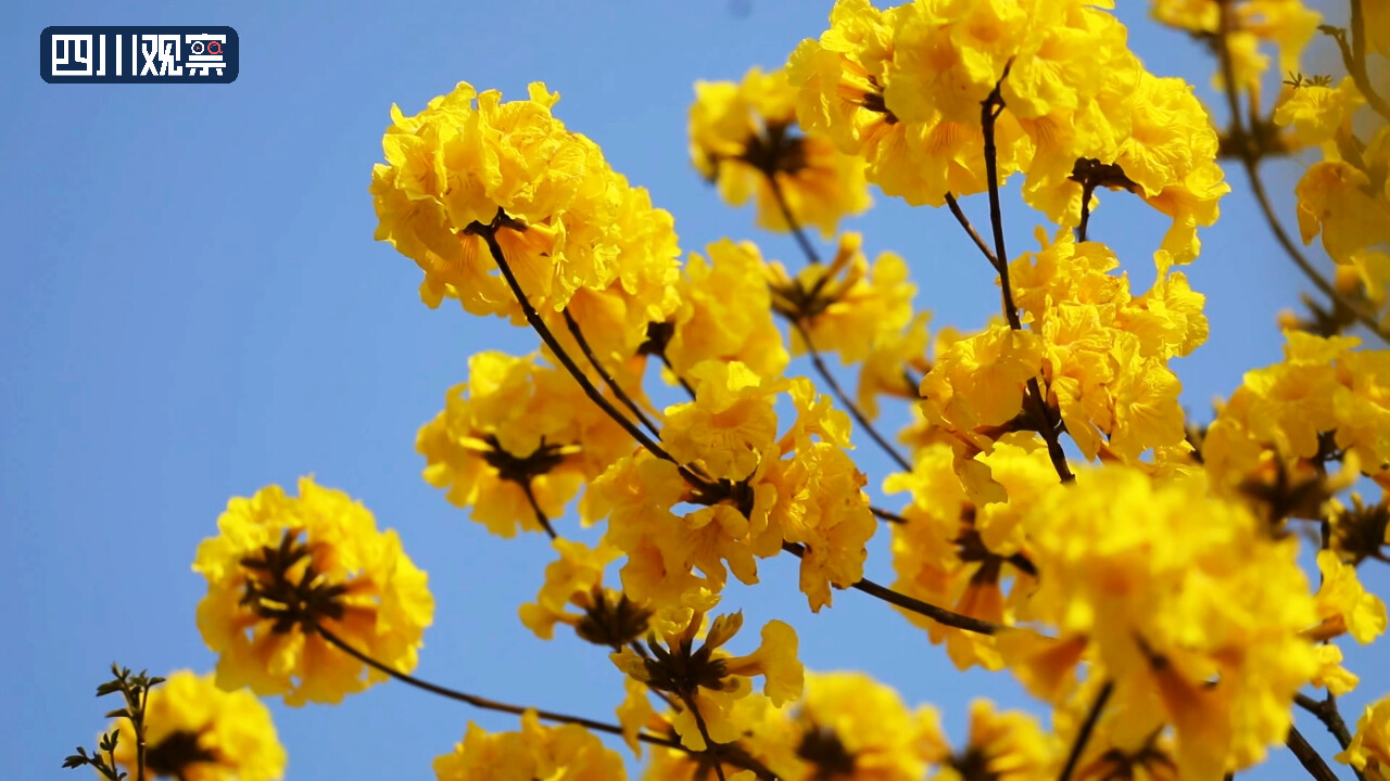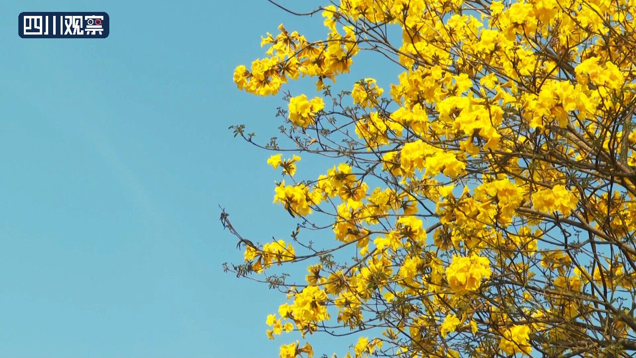 眼下,内江市资中县明心寺镇宜古寺村的4000余株黄花风铃木迎风怒放,宛如一片金色海洋。春风拂过,一串串“风铃”随风起舞。