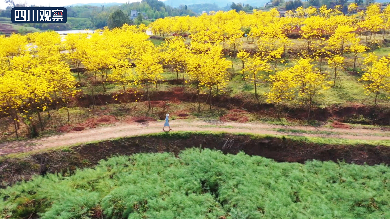 走进泸县天兴镇志诚村,从空中俯瞰,黄花风铃木沿着山坡整齐排列着,黄色花朵一团团,一簇簇,相互交错间渲染出一片浓烈的春意。这片黄花风铃木占地面积达120亩,每年4月初,万树尽戴黄金甲。