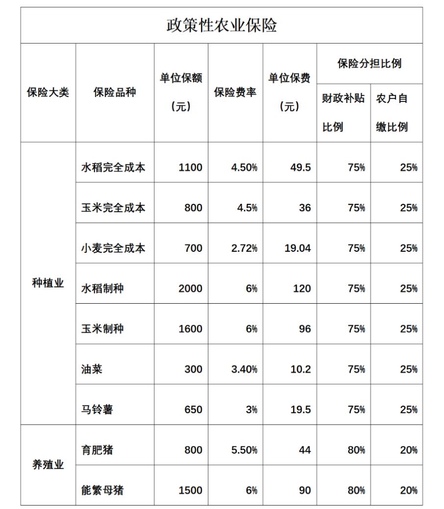 水稻完全成本保险:保险金额1100元/亩,保险费率为4.5%,单位保费49.5元/亩,其中农户自缴12.375元/亩,财政补助37.125元/亩。
