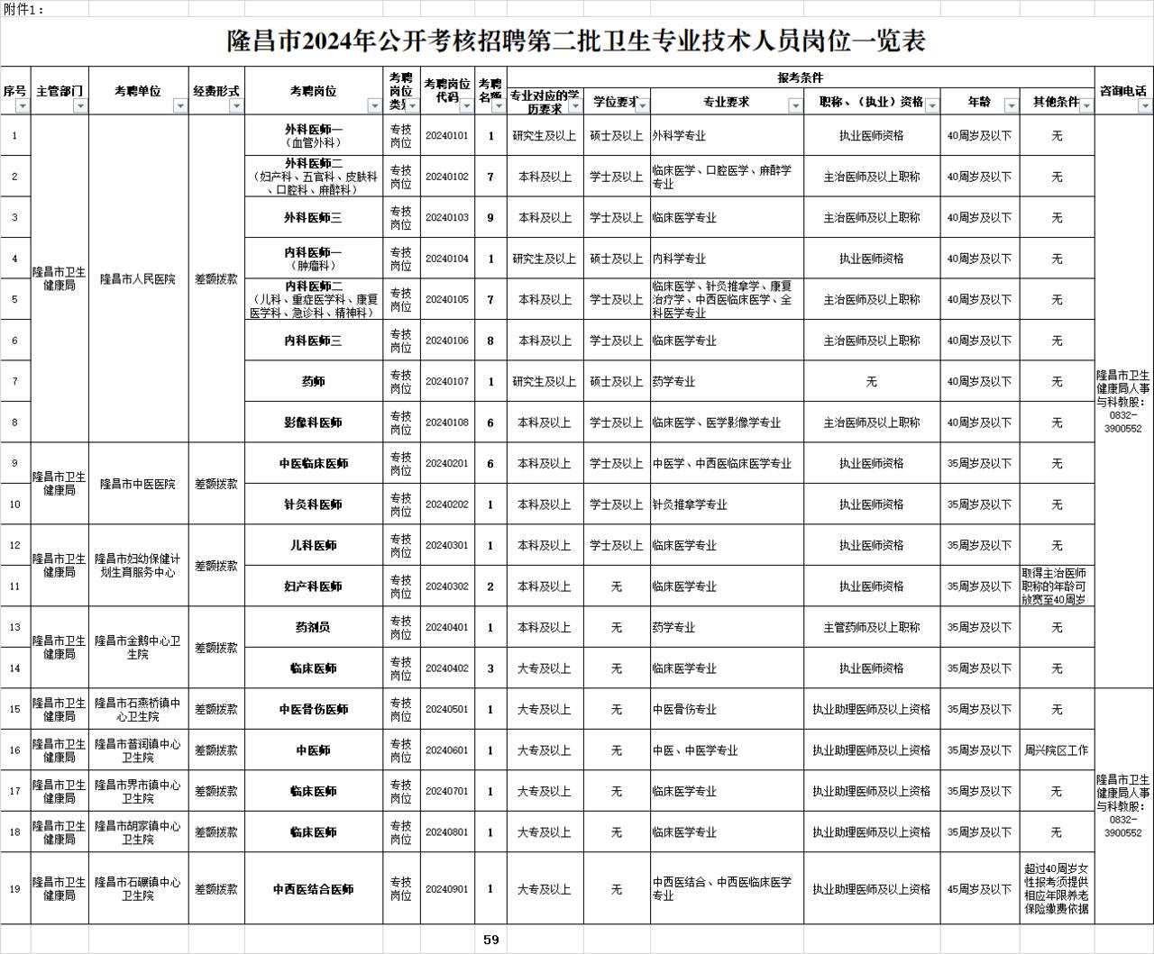 具体岗位、名额及单位性质等详见《隆昌市2024年公开考核招聘第二批卫生专业技术人员岗位一览表》(附件1)。