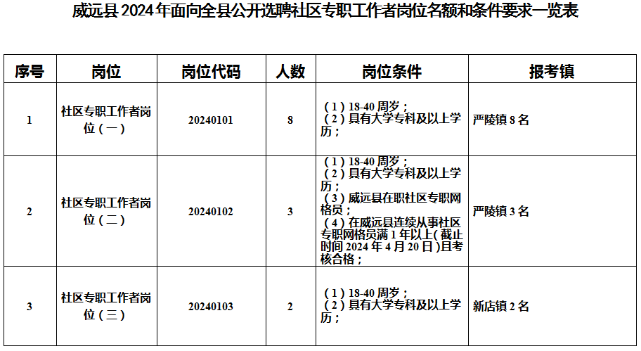 (九)符合选聘岗位所需的其他具体条件及资格要求,详见《威远县2024年面向全县公开选聘社区专职工作者岗位名额和条件要求一览表》