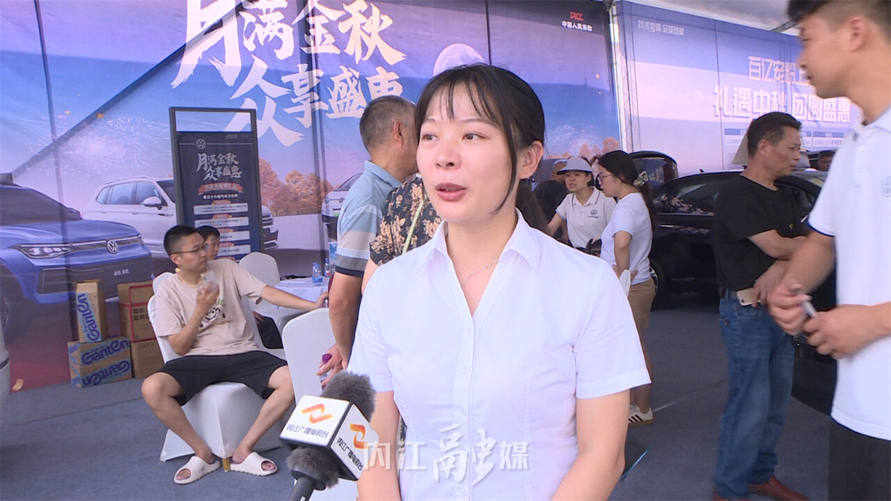 上汽大众内江合众4s店市场专员朱兴美介绍道:“这次中秋节车展,我们总共来了五台(种)车型,其中新上市的途岳新锐也到了,一口价七万九千九起,以旧换新的话,最高优惠是三万五,车展现场有很多的小礼品,包括月饼,还有其他一些小东西, 欢迎大家来车展看车、赏车。”