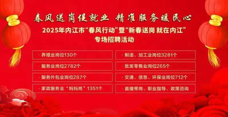1月26日,记者从内江市就业创业促进中心了解到,2025年内江市“春风行动”暨“新春送岗 就在内江”专场招聘活动将于2月7日在内江万达广场二号门举行,活动邀请100余家企业现场招聘,提供包括养殖、制造、加工、服务外包业、交通、信息、环保、家政服务业“妈妈岗”等超8800个工作岗位,总有一个适合您。