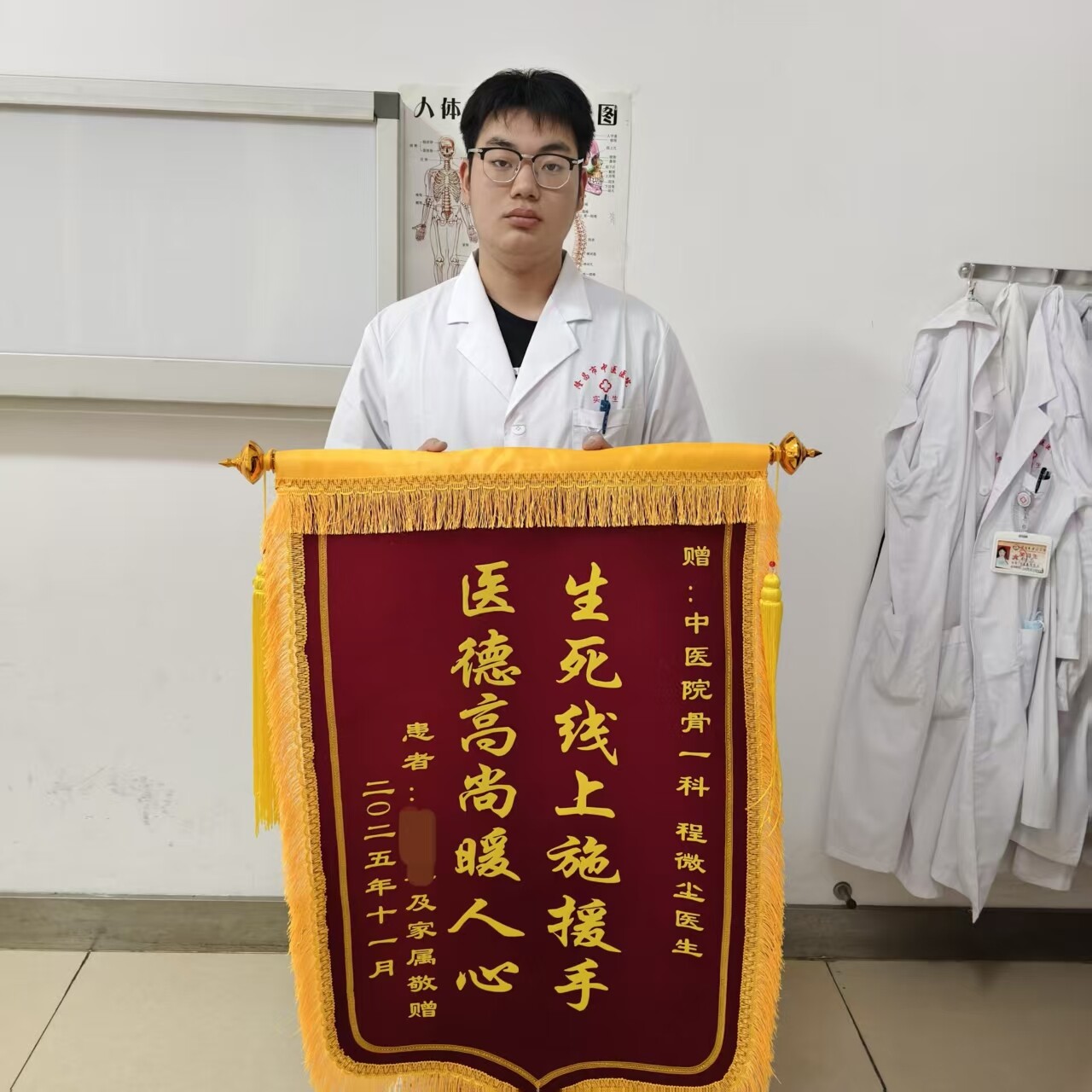 推让再三,程微尘还是接过了锦旗,并真诚地表示,这面锦旗不只是属于我个人,作为一名医学生,学校的老师一直教导我们“敬佑生命、救死扶伤”是医者的天职,这面锦旗不只是属于我个人,更是更代表着所有医学生的责任与承诺。