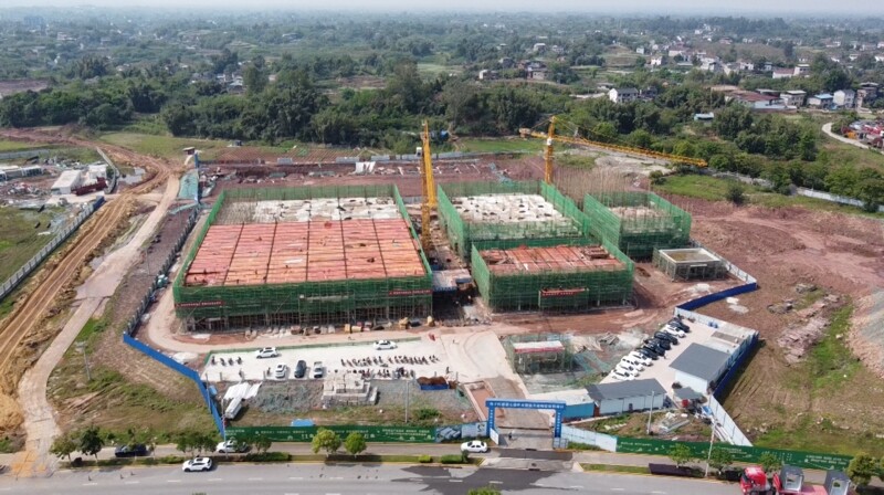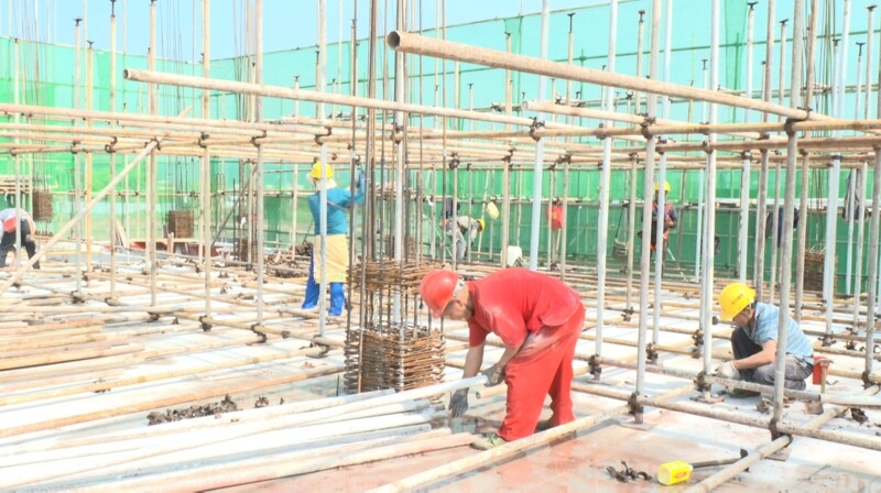 记者万丹丹介绍道,“我现在是在电子传感器元器件及微波介质陶瓷材料项目的现场,在我身后,工人们正在进行钢筋绑扎、水电预埋和模板加固,现场一派热火朝天的建设景象。”