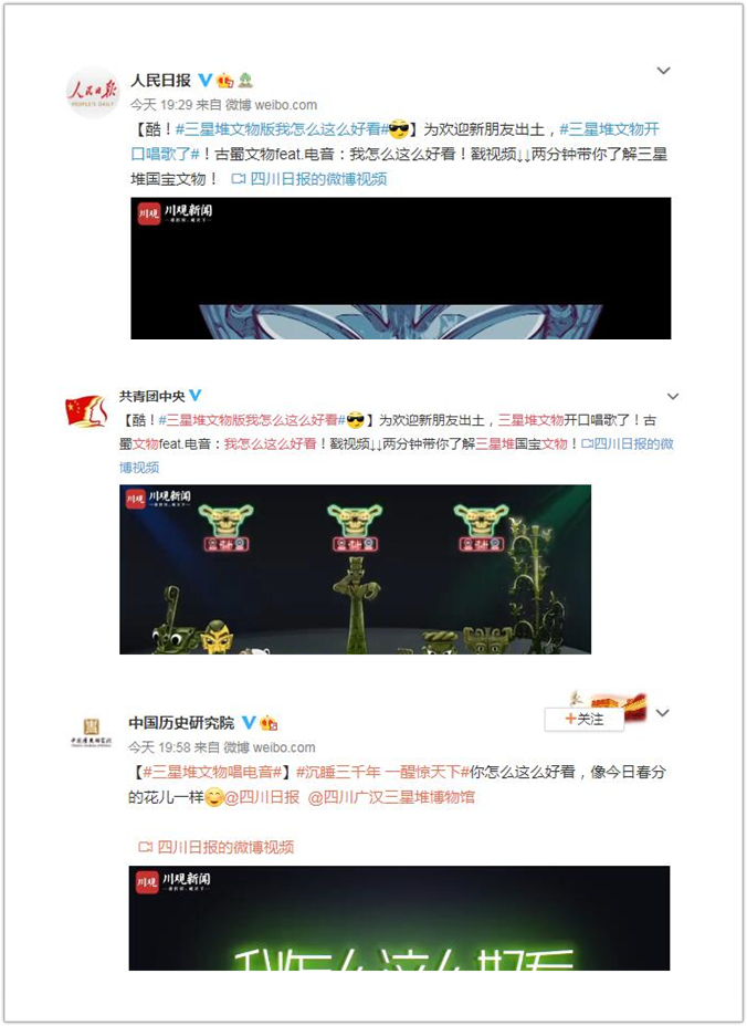 20日,《我怎么这么好看》MV被新华社、人民日报、央视频、共青团中央、中国历史研究院等官媒转载,QQ音乐、今日头条、百度百家号、腾讯新闻、西瓜视频等视频平台首页推荐。发布5小时后,微博话题#三星堆文物版我怎么这么好看#冲上热搜。截至21日11时,相关微博话题阅读量达4329万,川观新闻微信视频号转评超10万,全网浏览量、曝光量超2亿。