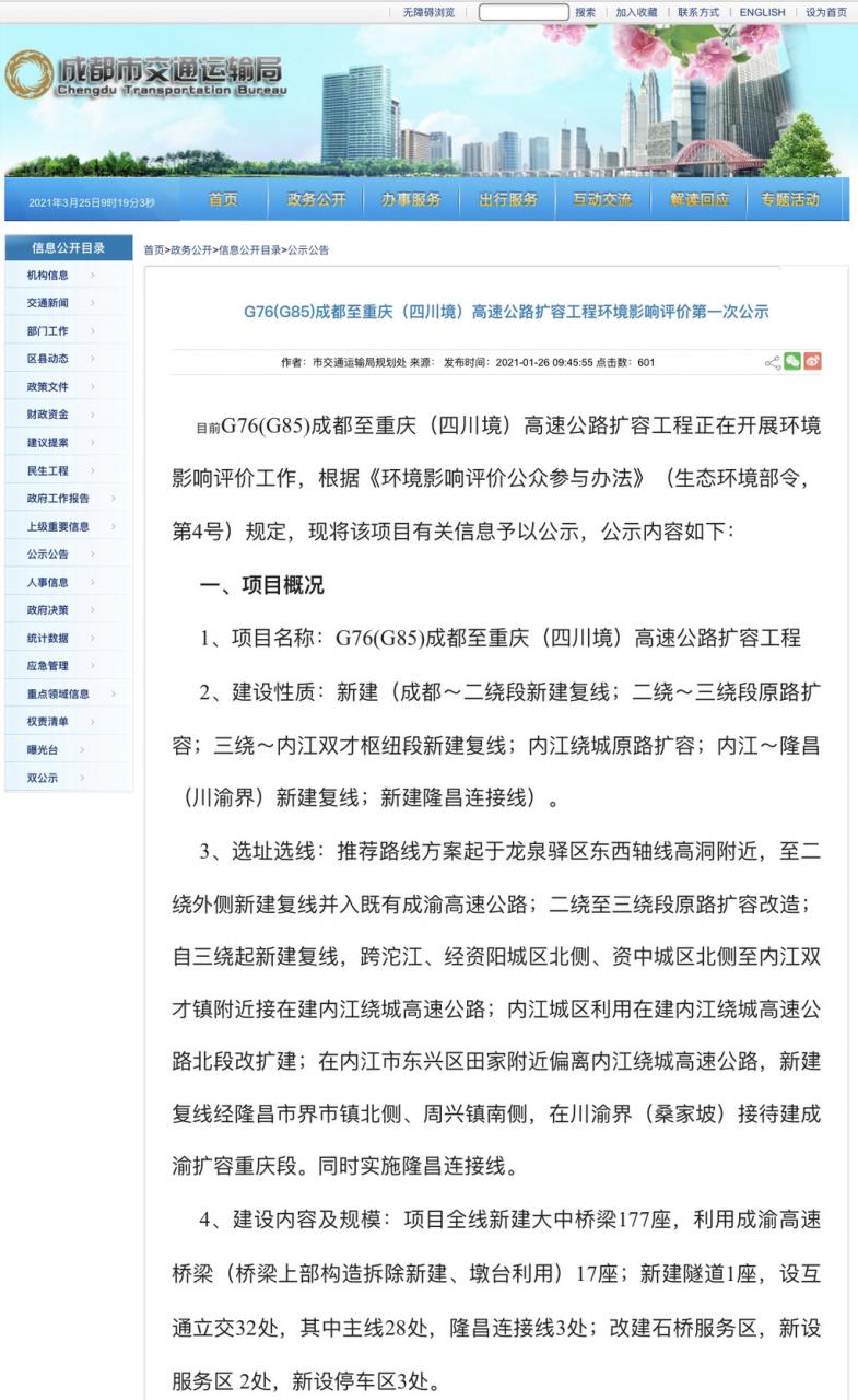 3月25日,记者从成都市交通运输局获悉,目前,京昆高速公路绵阳至成都段扩容工程(重新报批)进行环境影响评价第一次公示。此前,G76(G85)成都至重庆(四川境)高速公路扩容工程也进行了环境影响评价第一次公示。