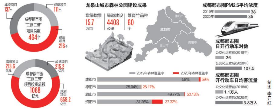 目前,“两环三射”轨道交通骨架加快构建,市域铁路成资S3线开工,成德S11线、成眉S5线加快推进前期工作,成都外环铁路通过预可研审查。14个“断头路”打通项目开工建设,螺简路等5个项目建成通车。都市圈日开行动车达107.5对、为公交化运营前的3倍,日均客流量 达3.8万余人次、为公交化运营前的3.5倍,跨市公交增至9条、日均客流量达2.2万余人次。