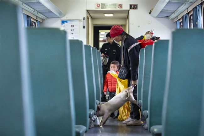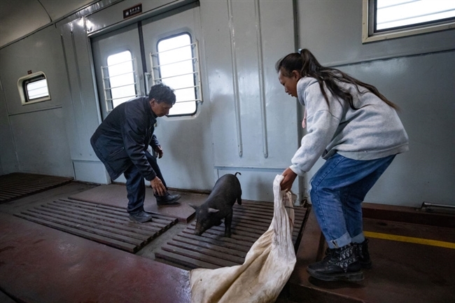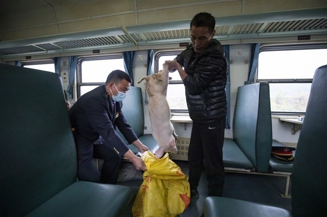 ↑在5633次列车的行李车厢,乘客准备把他们带上车的小猪装到袋子里(4月11日摄)。为了方便群众运送动物,5633/5634次列车对行李车厢专门进行改造,黄牛、山羊、猪、马,都是这儿的“常客”。