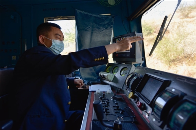 ↑中国铁路成都局集团公司成都客运段5633/5634次列车驾驶员赵玮在发车前确认信号(4月11日摄)。