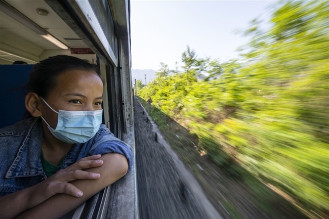 ↑在乘坐5633次列车从家返校途中,一名学生望着窗外的风景(4月11日摄)。