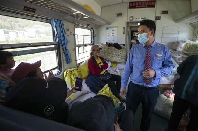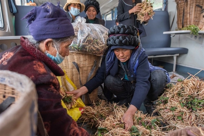 ↑在5633次列车上的“流动集市”,一名彝族妇女(左一)向其他乘客售卖新鲜的折耳根(4月11日摄)。