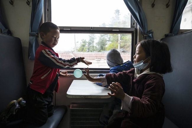 ↑两名小乘客乘坐5633次列车去外地上学(4月11日摄)。