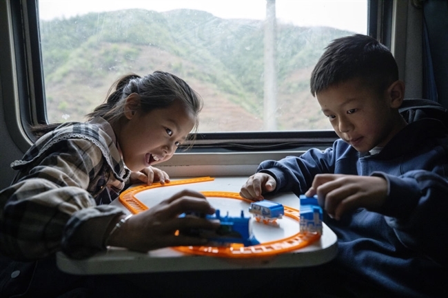 ↑在乘坐5633次列车从家返校途中,喜德县城关小学三年级学生阿尔伍支(左)和弟弟罗泽元在玩火车玩具(4月11日摄)。姐弟俩几乎每个星期都坐这趟火车往返于家和学校之间。